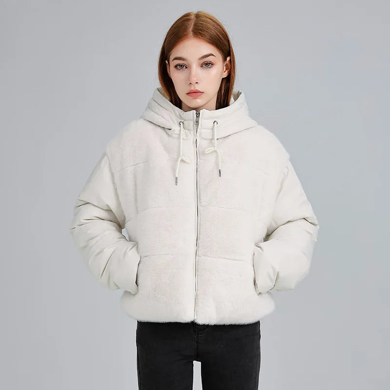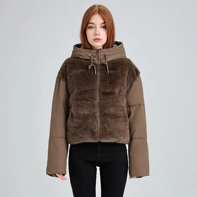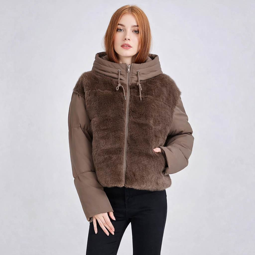 Soft plush paneling adds cozy warmth, while the hood keeps the look casual. A smooth lining and full zip front make it comfortable for everyday cold weather wear.